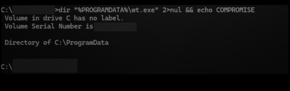 dir "%PROGRAMDATA%\wt.exe" 2>nul && echo COMPROMISED