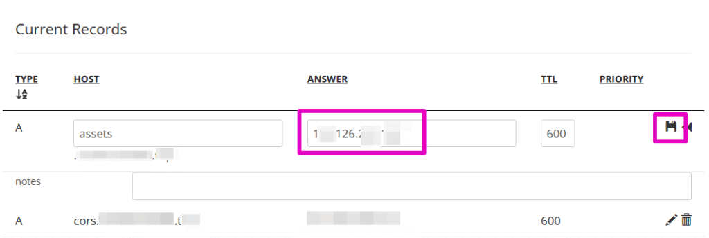 Continuing this example at Porkbun: Select the pencil icon. Highlight the Answer field entry and replace it with your new IP address. (copy and paste is OK) Select the save disk icon. When finished editing the 4 A Records, you may log out of Porkbun.